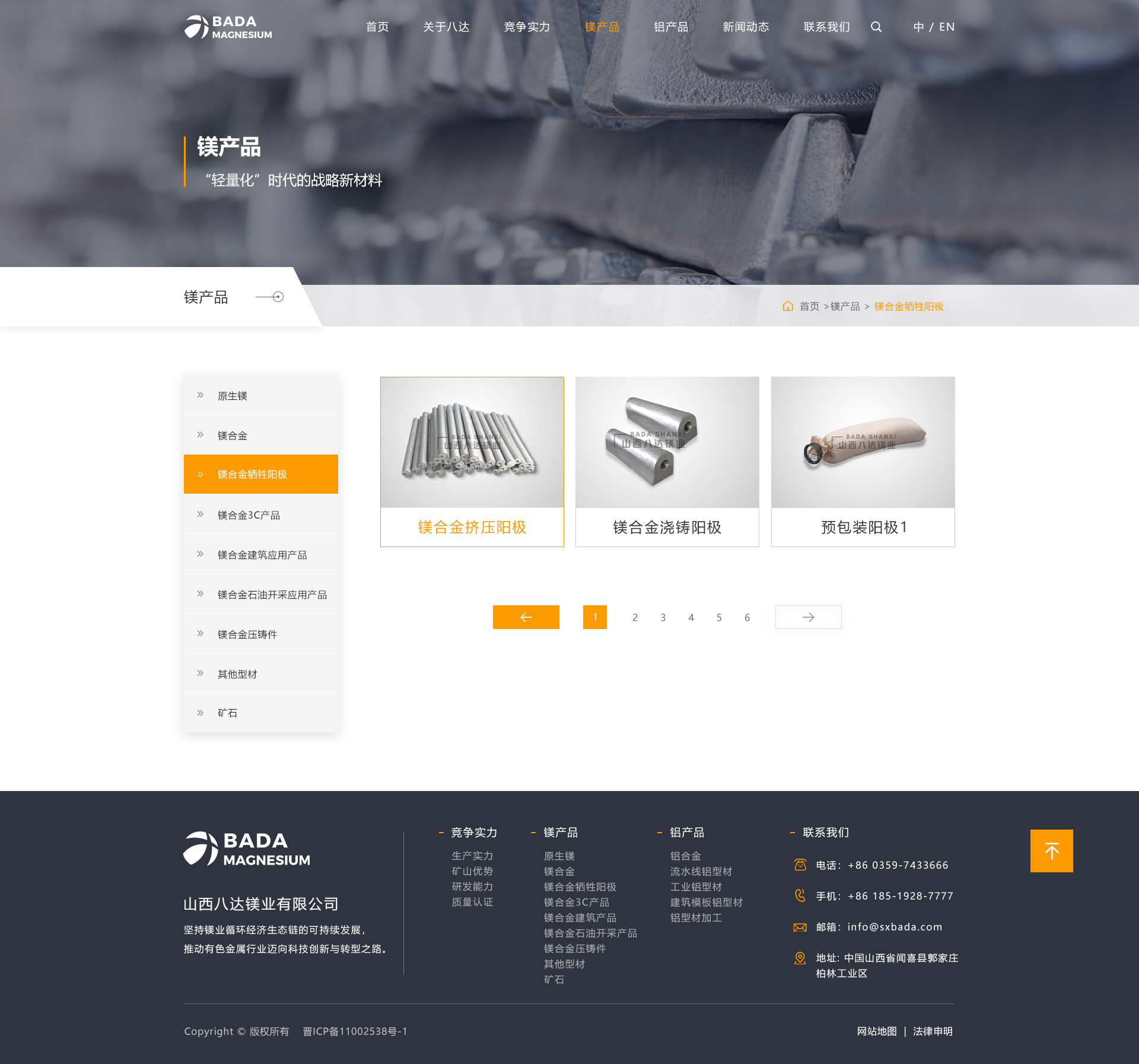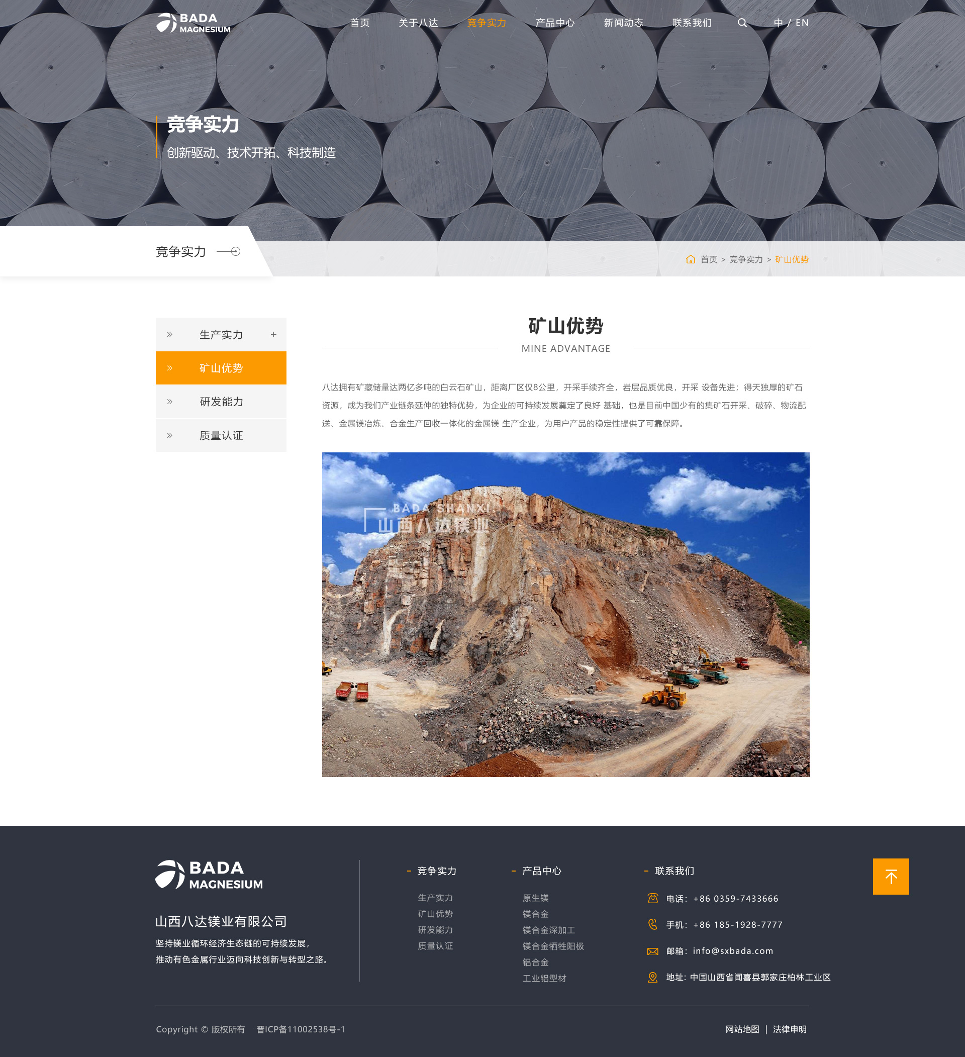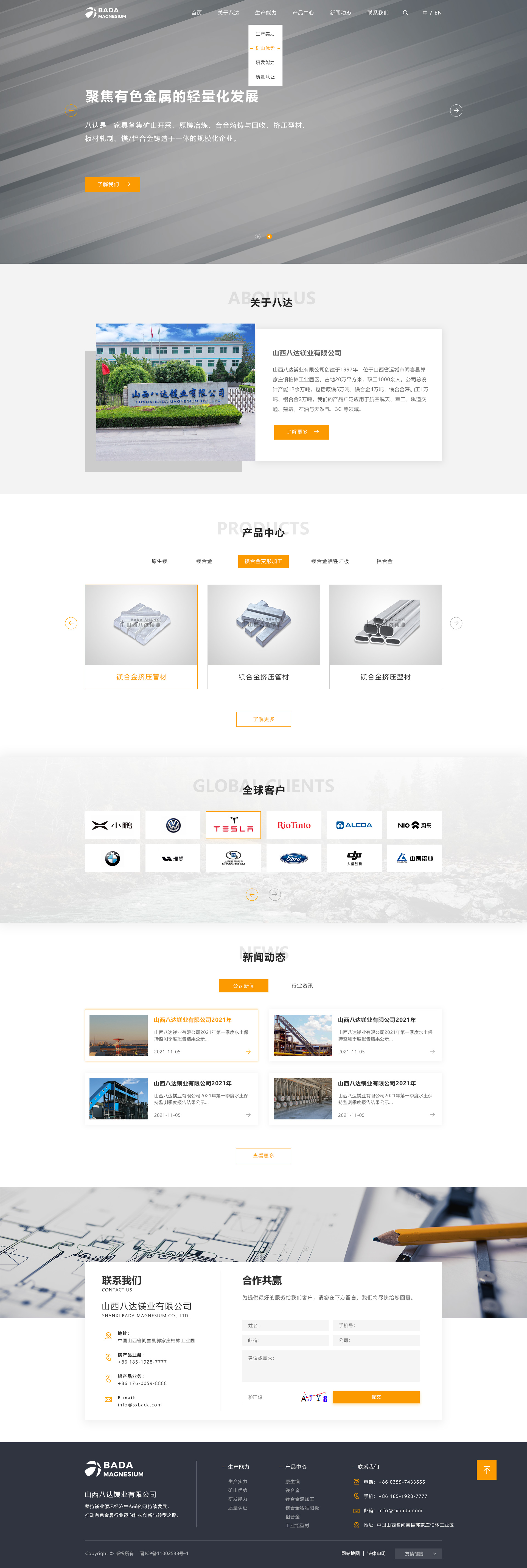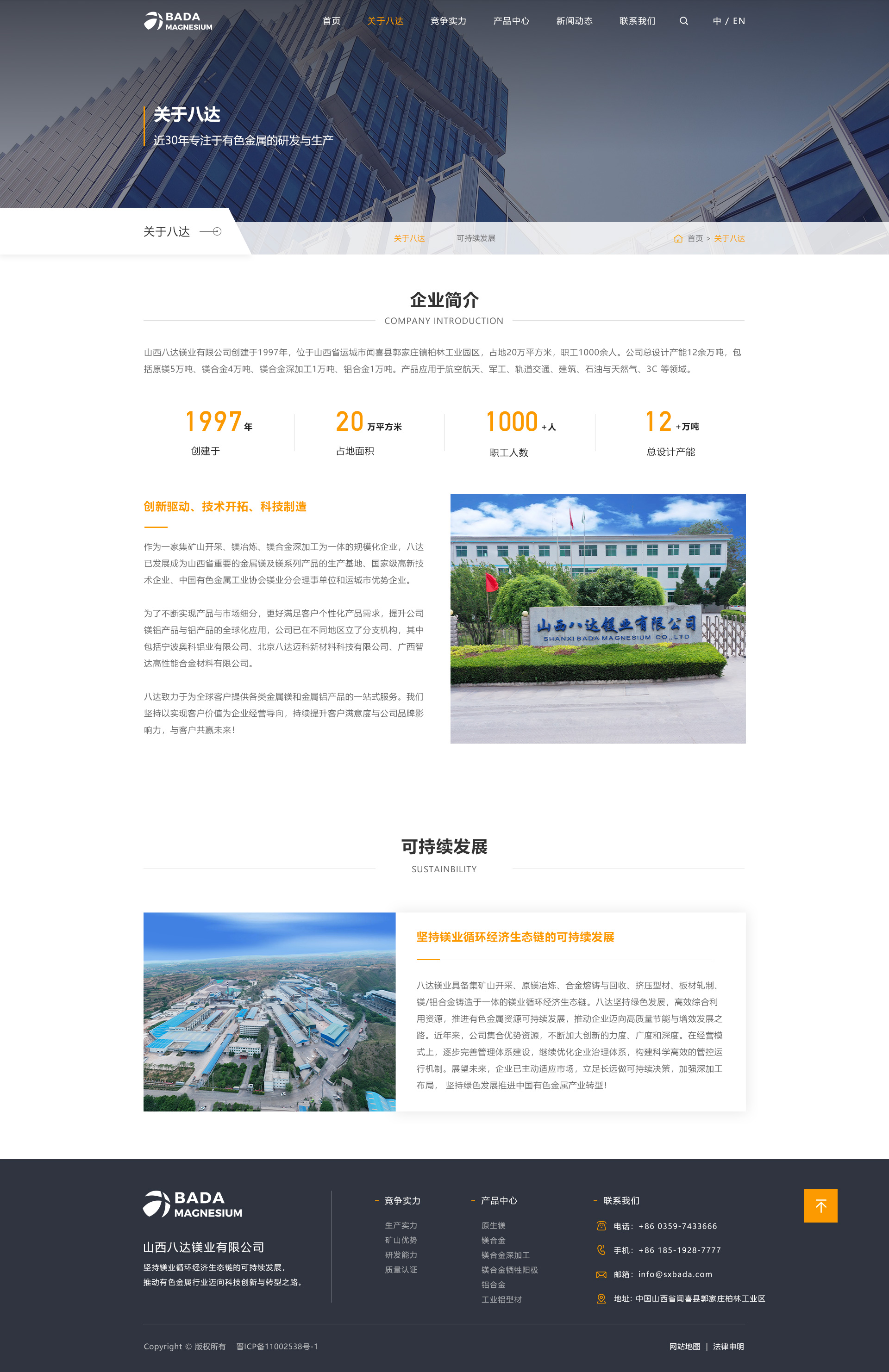 山西八达镁业有限公司始创于1997年,是一家集矿山开采、原镁冶炼、合金熔铸与回收、镁/铝合金铸造、镁/铝合金压延加工于一体的规模化企业,连续多年跨入中国金属镁生产前五强,是山西省重要的金属镁及镁系列产品生产基地、高新技术企业、中国有色金属工业协会镁业分会理事单位和运城市优势企业。